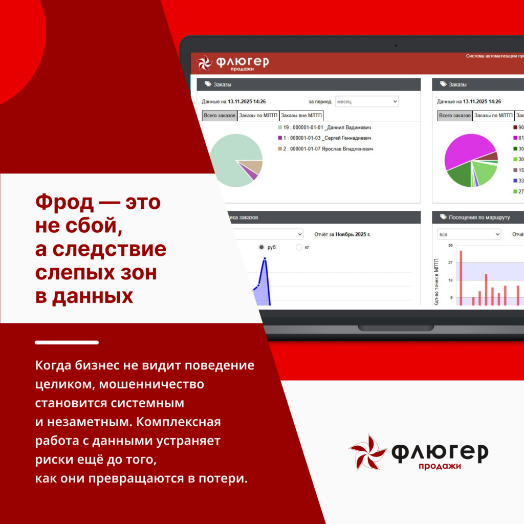 В системе «Флюгер-Продажи» такие риски изначально не становятся проблемой. Комплексный подход к данным и процессам заложен в архитектуру с самого начала, поэтому устойчивость достигается не за счёт «латания дыр», а как естественное состояние системы. Именно так, по нашему опыту, и работает зрелый антифрод — незаметно, постоянно и на опережение.