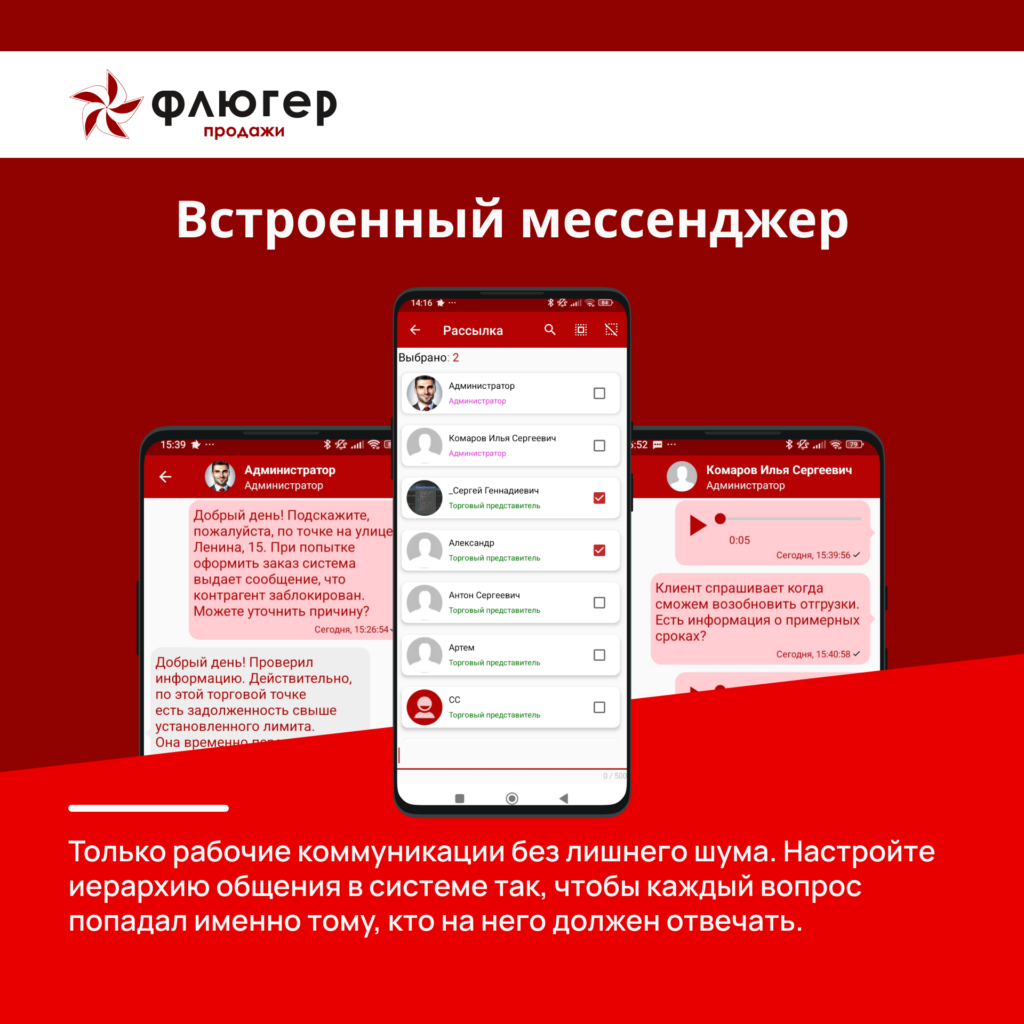 Например, можно настроить возможность прямой коммуникации между торговым представителем и его непосредственным супервайзером, при этом ограничив или направив через супервайзера сообщения в адрес руководителей более высокого уровня.