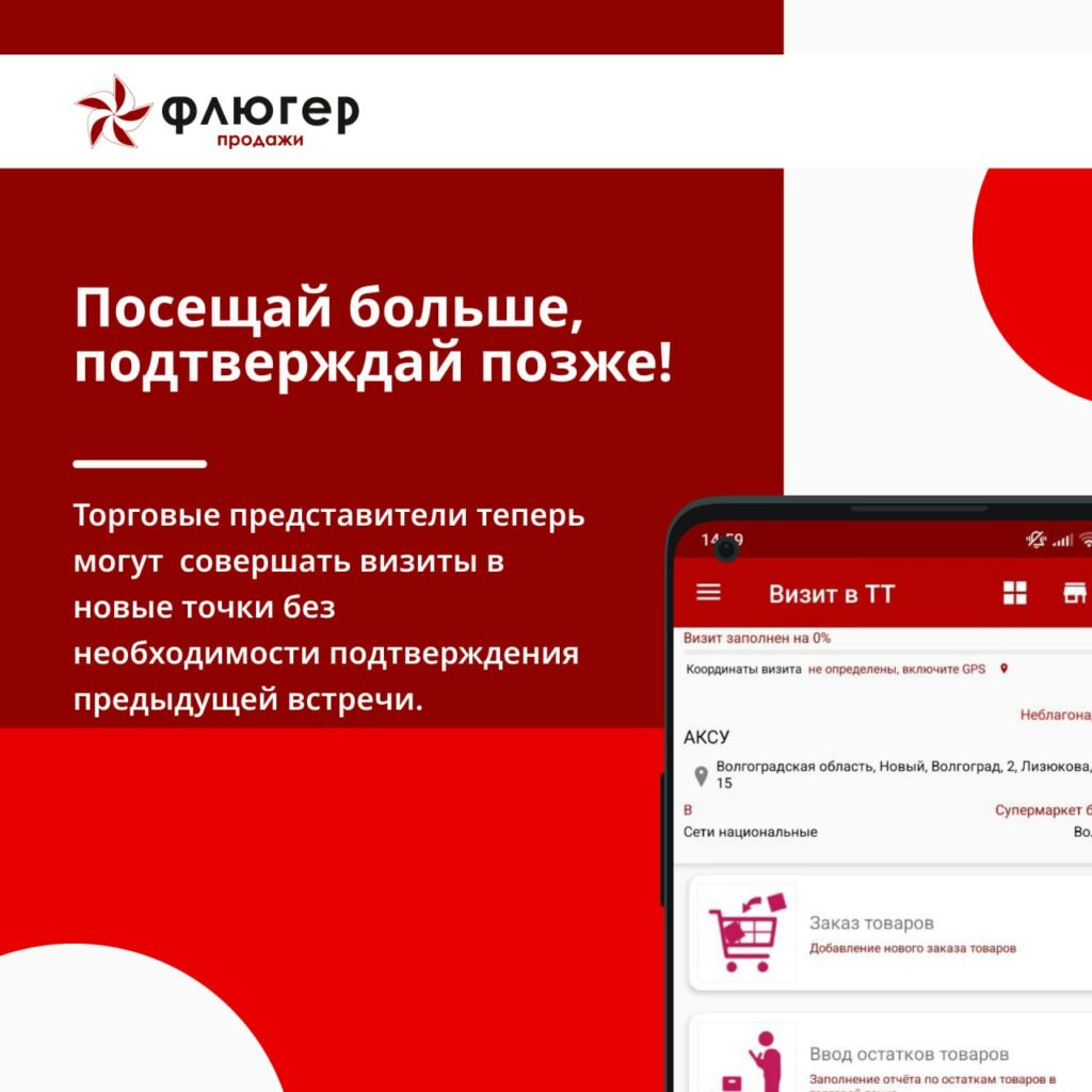 Торговые представители теперь могут начинать визиты в новые торговые точки, не подтверждая предыдущие встречи. Это позволяет эффективнее использовать время и посещать больше клиентов.