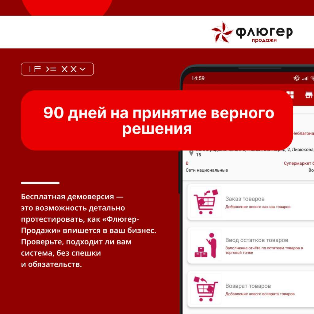 🔴Полный пакет возможностей системы «Флюгер-Продажи» на 90 дней, без ограничений по пользователям или функциональности.